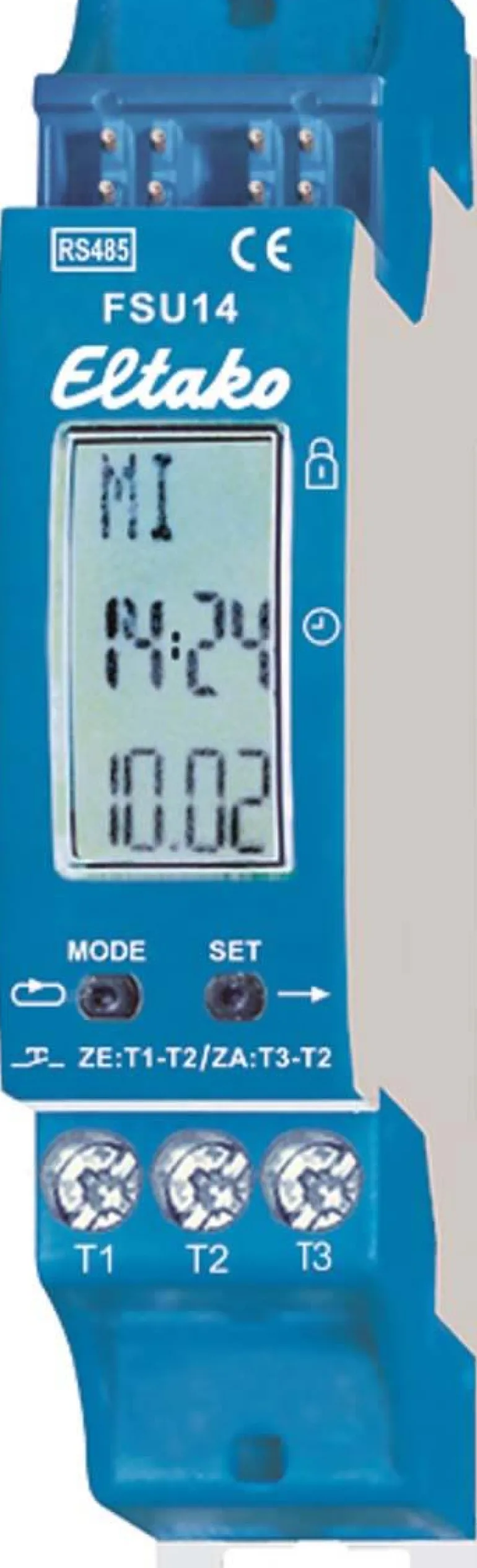 8-kanavainen kellokytkin näytöllä ja astrotoiminnolla. DIN-standardin EN 60715 TH35 mukainen DIN-kiskoon asennettava yksikkö, syvyys 58 mm. Liitäntä Eltako RS485-väylään. BUS ja virtalähde kytketään nopeasti sankoihin. Valmiustilan kulutus vain 0,1 wattia.