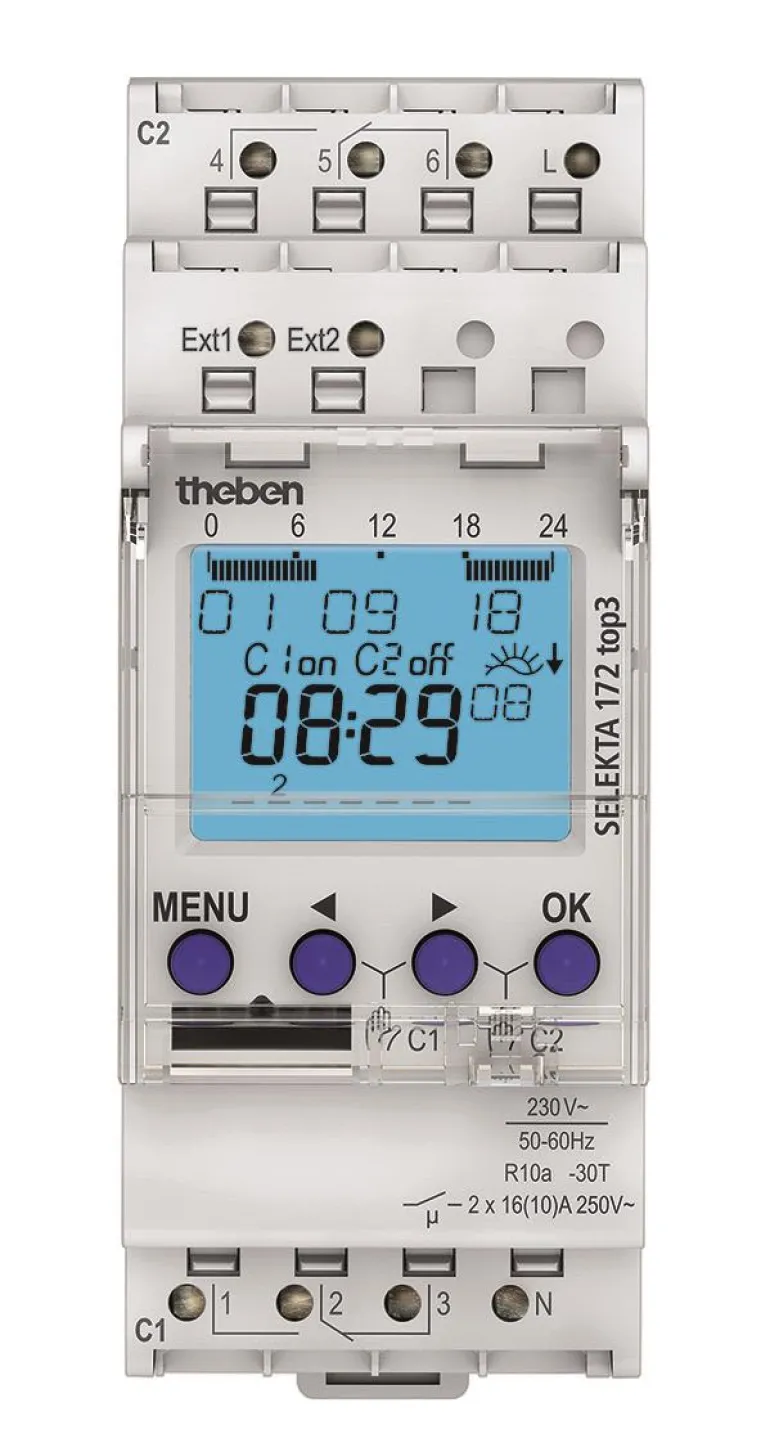 Selekta 172 top3 -astro-kellokytkin viikko-ohjelmalla. 2 kanavaa, 2 ulkoista tuloa. Astro-kellot eivät vaadi ulkoista valotunnistinta, vaan valo syttyy ja sammuu maantieteellisten parametrien, pituus- ja leveysasteiden mukaan. Kello laskee auringon nousun ja laskun maantieteellisen sijainnin perusteella määritellylle sijainnille vuoden kaikille päiville. Tarkoitettu asennettavaksi DIN-kiskoon. Kolme eri mallia yhdellä/kahdella kanavalla astronomisella päivä-/viikko-ohjelmalla. Looginen ja yksinkertainen tekstipohjainen ohjelmointi ja selkeät valikot. Suurikontrastinen selkeä teksti taustavalaistulla näytöllä.