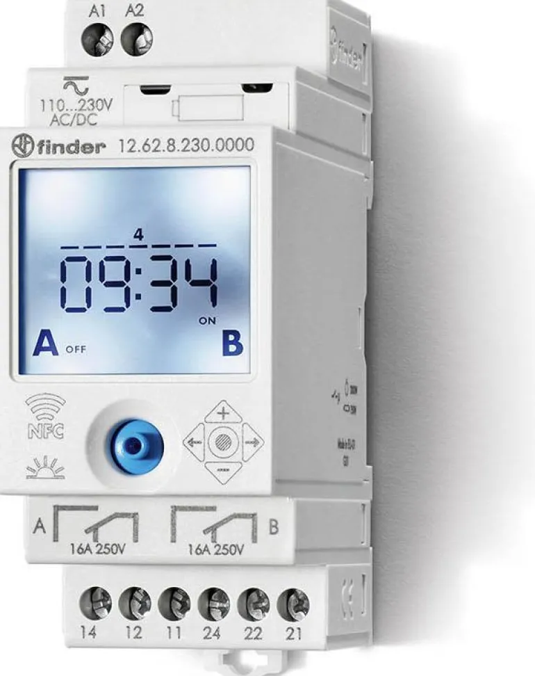 Viikkokello, jossa vaihtokytkin 16 A 110…230 VAC/DC. Ohjelmoidaan NFC:llä ja/tai ohjaussauvalla.