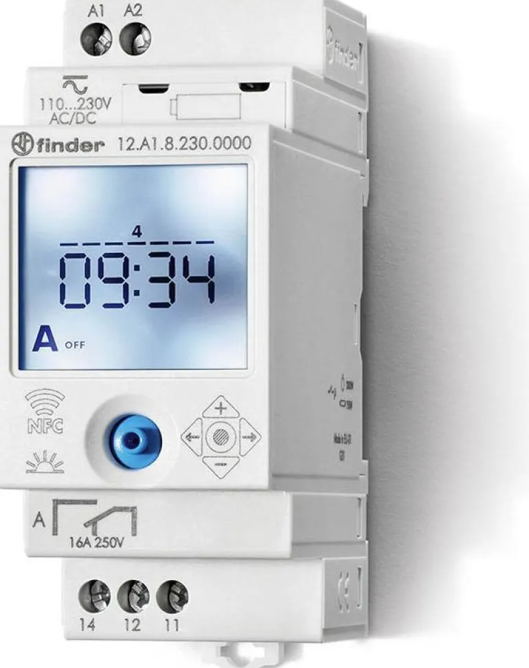 Astronominen kellokytkin, jossa vaihtokytkin, 16 A 110…230 VAC/DC. Ohjelmoidaan NFC:llä ja/tai ohjaussauvalla. Pulssi 1 sekunnista 59 minuuttiin. Suuri taustavalaistu näyttö. Helposti saatavilla oleva, vaihdettava akku. Muistipaikkoja 50.