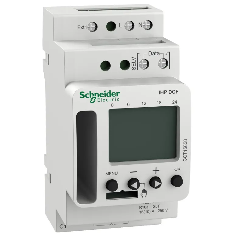 Schneider Electric CCT15858 Acti9 IHP -kellokytkin, ohjelmoitavissa. Ohjelmoitavissa älypuhelimen kautta yhdessä tuotteen CCT15862 kanssa. Leveys (moduulipaikkojen määrä) 2,5, 84 muistipaikkaa. Synkronisoitavissa DCF -antennin kautta.
