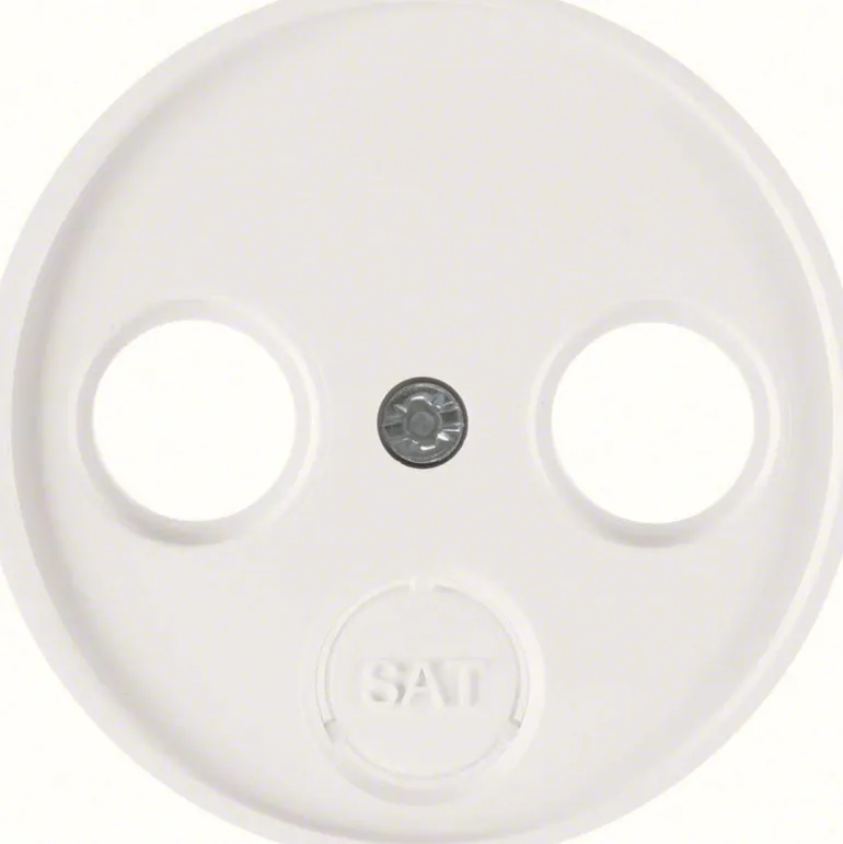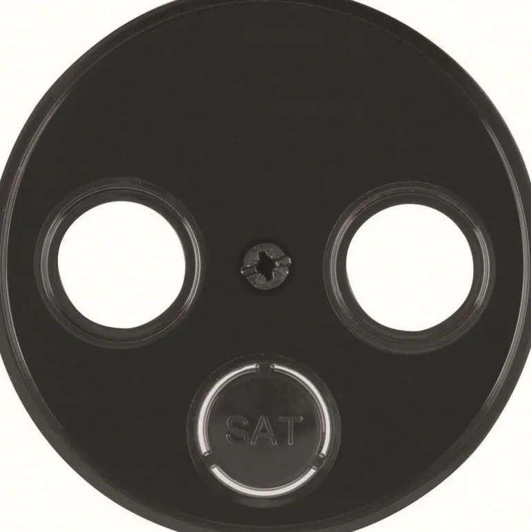 Pyöreä C-aluslevy SAT/TV:llä tai vain SAT-pistorasian aukolla, tuotteessa tekstimerkintä. Saatavana mustana tai valkoisena.