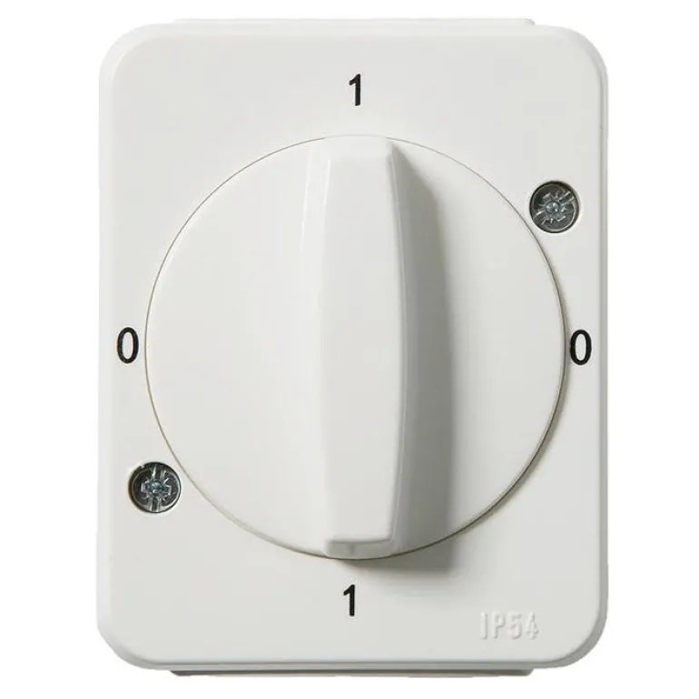 2-napainen kiertokytkin, jossa on kestomuovinen kotelointi ja läpivientireiät sekä yksi yksittäinen ja yksi kaksoiskalvonippa. Mallin nimellisjännite on 250 V, nimellisvirta 16 A ja se on halogeeniton. Pinta-asennukseen.