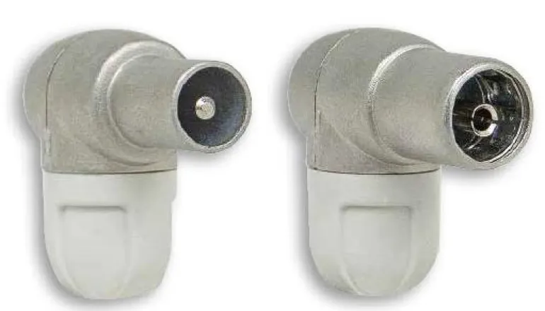 Kulmakoaksiaaliliitin IEC uros. Suojattu, impedanssi 75 ohmia. Tehokas suojaus poistaa häiriöt, liitintä voidaan käyttää uudelleen.