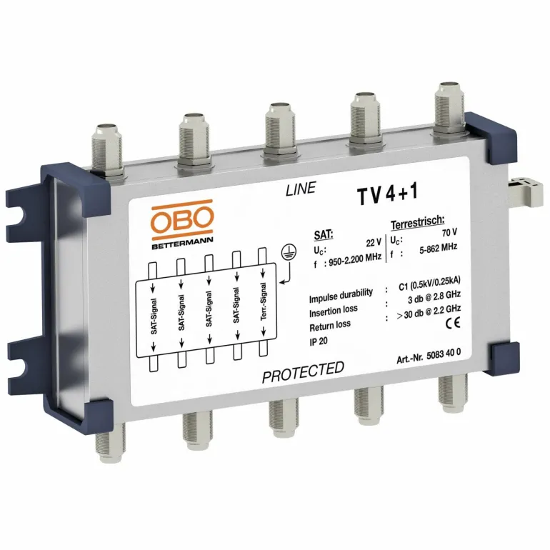 Koaksiaalinen tietoliikennesuojaus televisiovastaanottimille jopa neljän SAT-linjan suojaamiseksi. Optimaaliset siirto-olosuhteet 75 ohmin teknologialla. Käytetään televisio- ja SAT-laitteiden, monikytkimien, vastaanottimien ja DVB-T-vastaanottimien suojaamiseen.