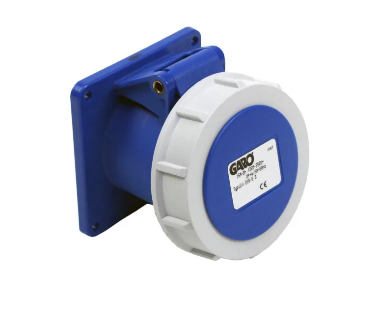 Vedenpitävä kojepistorasia (naaras) paneeliasennukseen. Asennuslevyn mitat 70×70 mm.