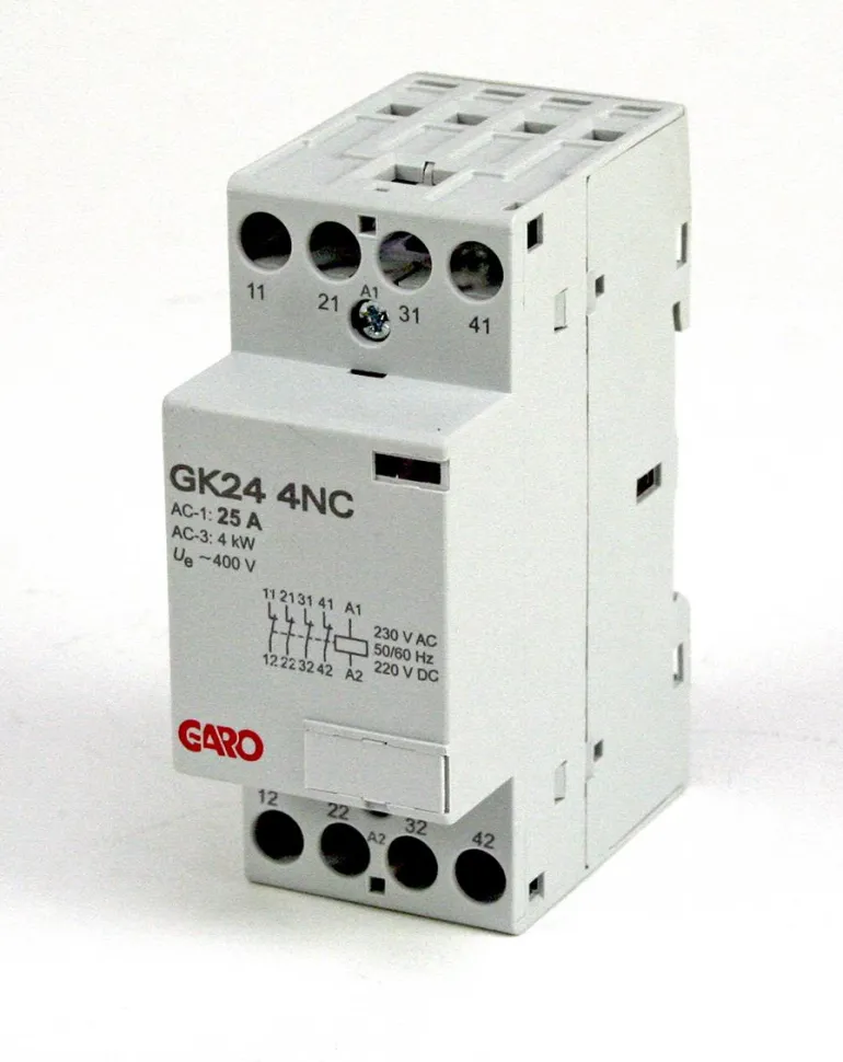 4-napaiset kontaktorit 24–63 A, joissa on erilaiset kelajännitteet.