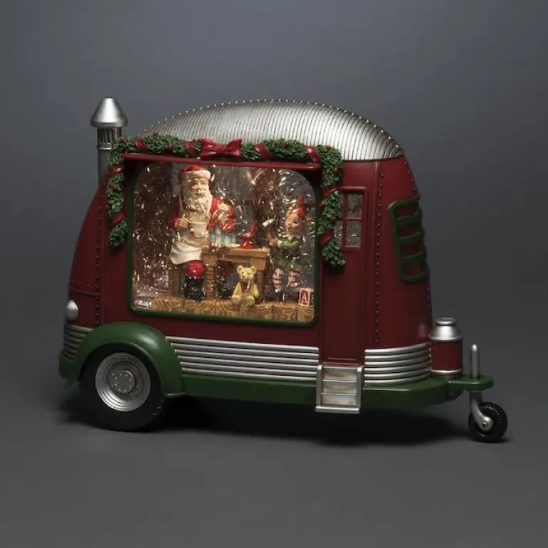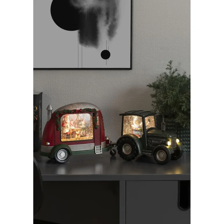 Vesitäytteinen asuntovaunu, jossa on joulupukki ja koristevalaistus. Valaisimessa on 5h ajastin ja 3 paristoa.