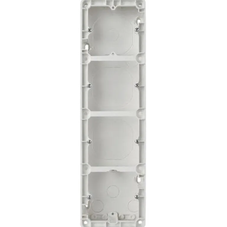 4-lokeroinen korotuskehys mm. upotettavia kytkimiä, yhdistelmäpistorasioita ja heikkovirtalaitteita varten. Voidaan asentaa kojerasiaan olemassa olevan asennuksen laajentamiseksi, kaapelin ulostulon yli tai kaapelilla syöttämiseen sivulta. Valmistettu halogeenittomasta kestomuovista, mitat 84 x 297 x 35 mm.