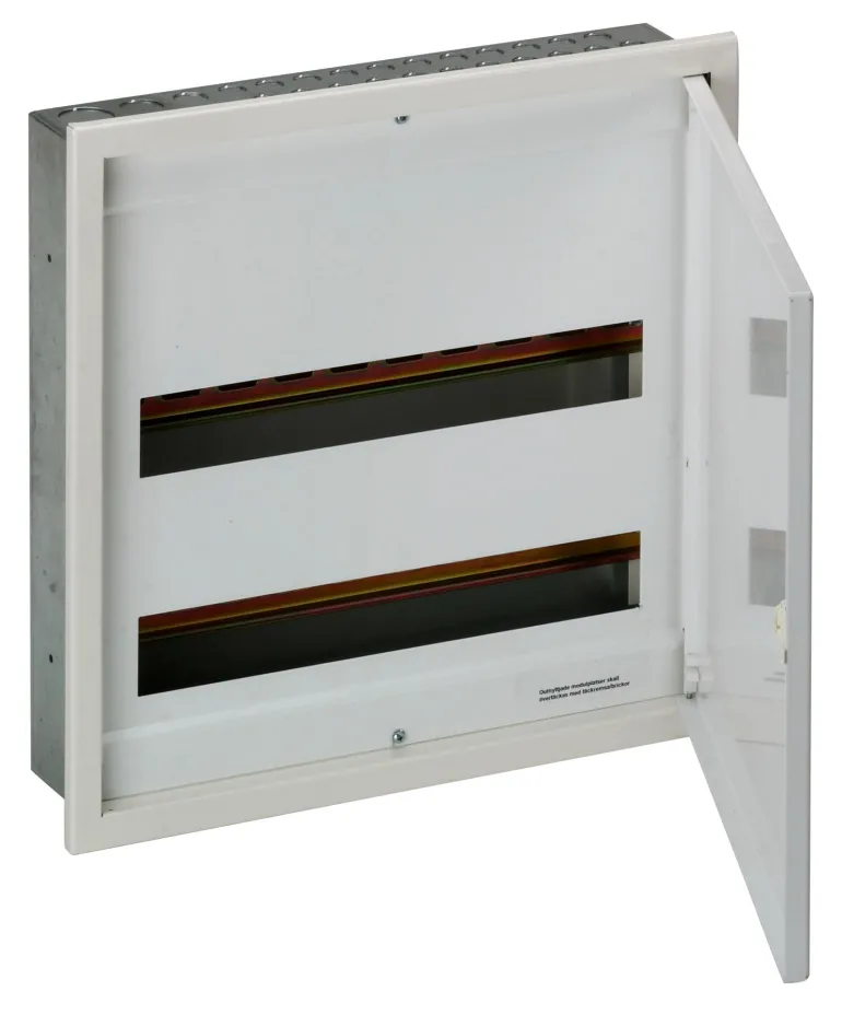 Moduulikomponenttien kotelo, jonka syvyys on enintään 89 mm, sekä metallinen upotusasennuslaatikko, jossa on puhkaistavat reiät saapuville kaapeleille. DIN-kisko teräslevyä, etukappale teräslevyä. Runko säädettävissä (syvyyssuuntaan), runko ja ovi peltiä, upotettu oven kahva.