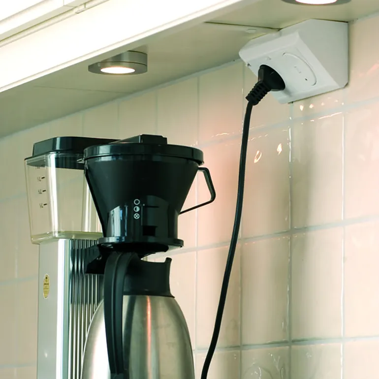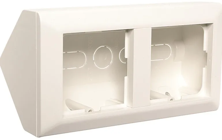 Kulma-asennukseen, IP21. Halogeenittomasta kestomuovista. Upotettaville kytkimille, yhdistelmäpistorasioille ja heikkovirtalaitteille jne., käytetään kulmiin tai keittiökaappien alle asennettaessa. Toimitetaan yhdistelmäkehyksen kanssa. Jännitteenpoistaja lisävarusteena