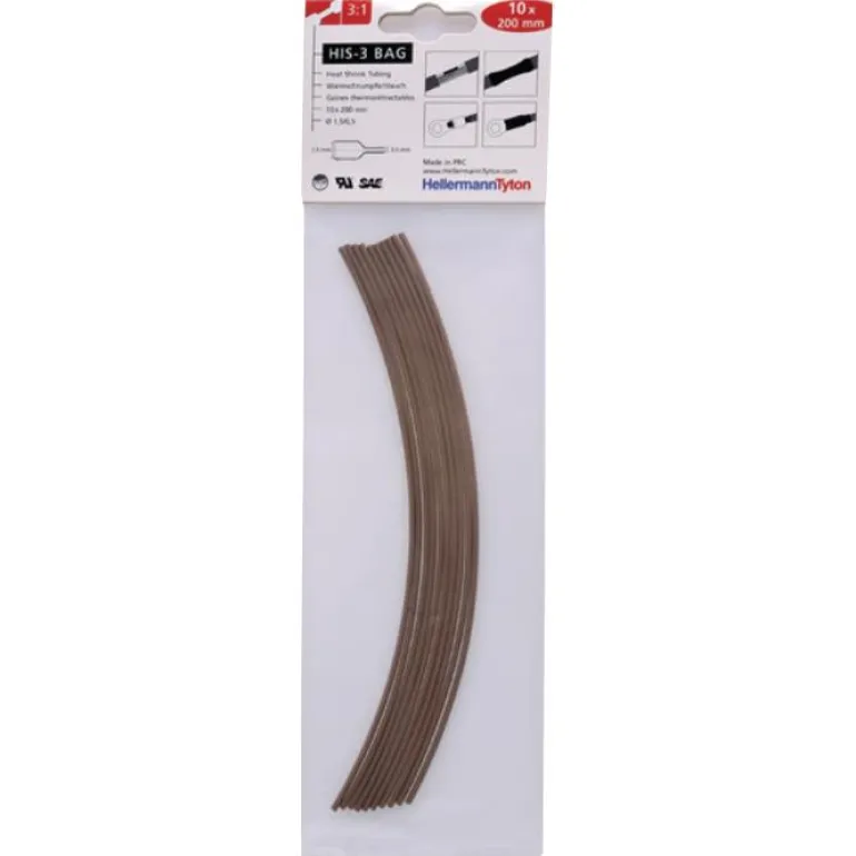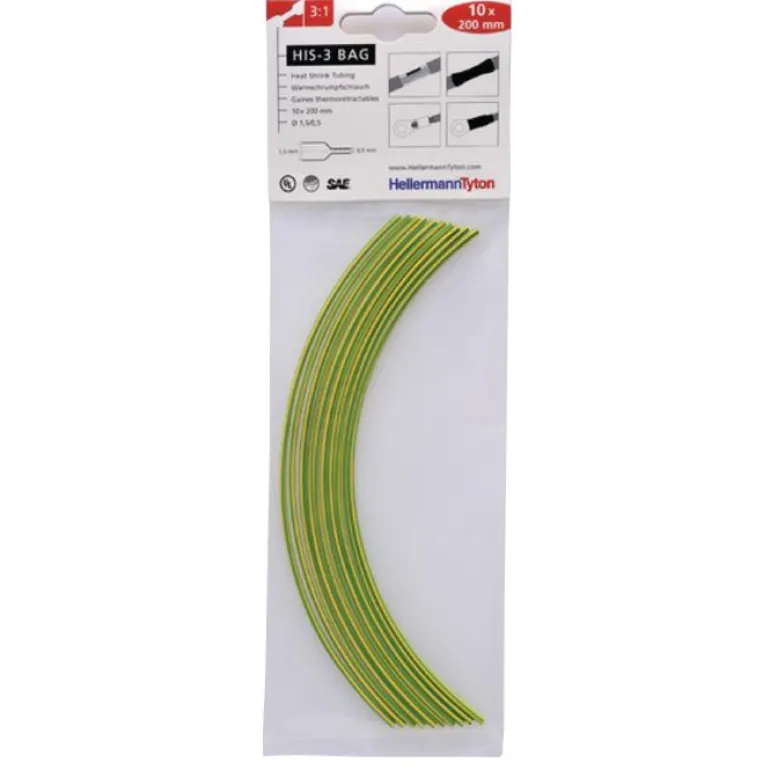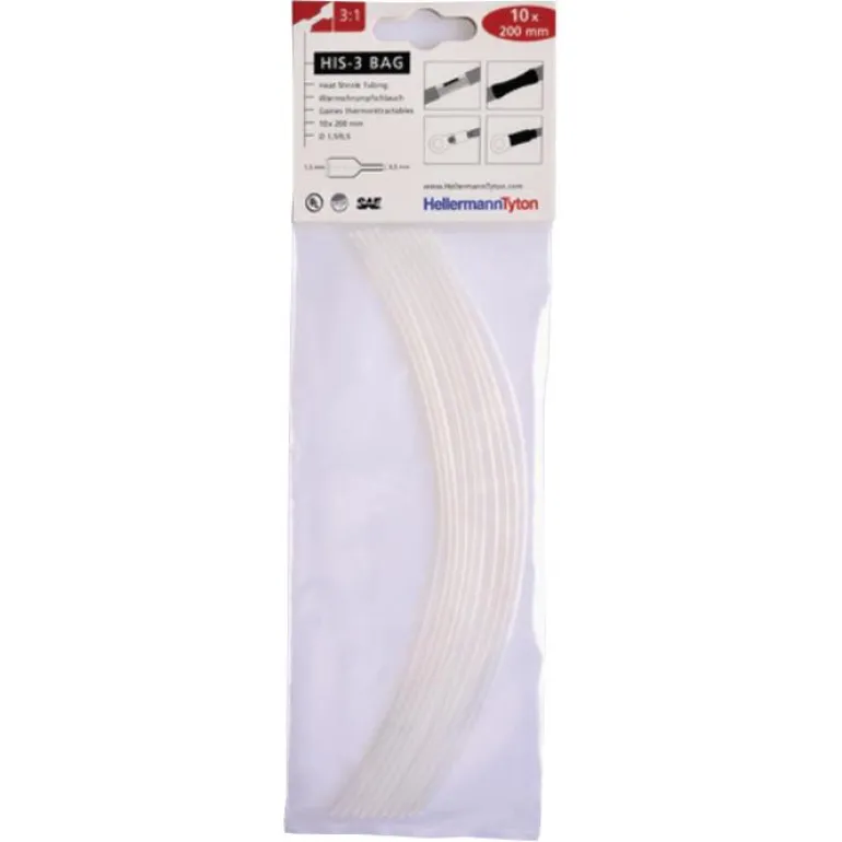 HIS-3 Bag -pakkaus sisältää 10 kpl kutistemuoviletkuja kaapelien ja liitinten eristämiseen ja suojaukseen. Ohutseinämäiset letkut ovat joustavia, ja ne on valmistettu ristisilloitetusta polyolefiinista. HIS-3 Bag -pakkauksen kutistemuoviletkujen halkaisija on 1,5/0,5 mm (kutistumaton/kutistunut) ja pituus 200 mm. Saatavissa eri värivaihtoehtoja.