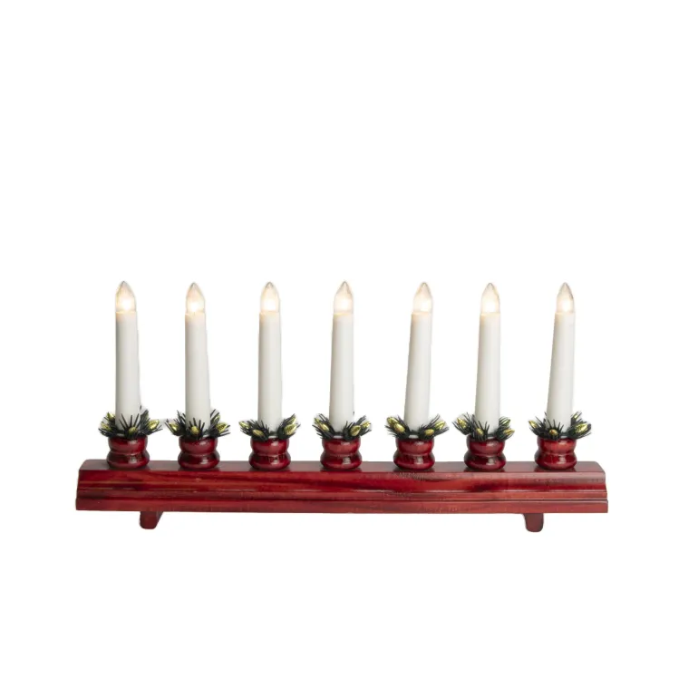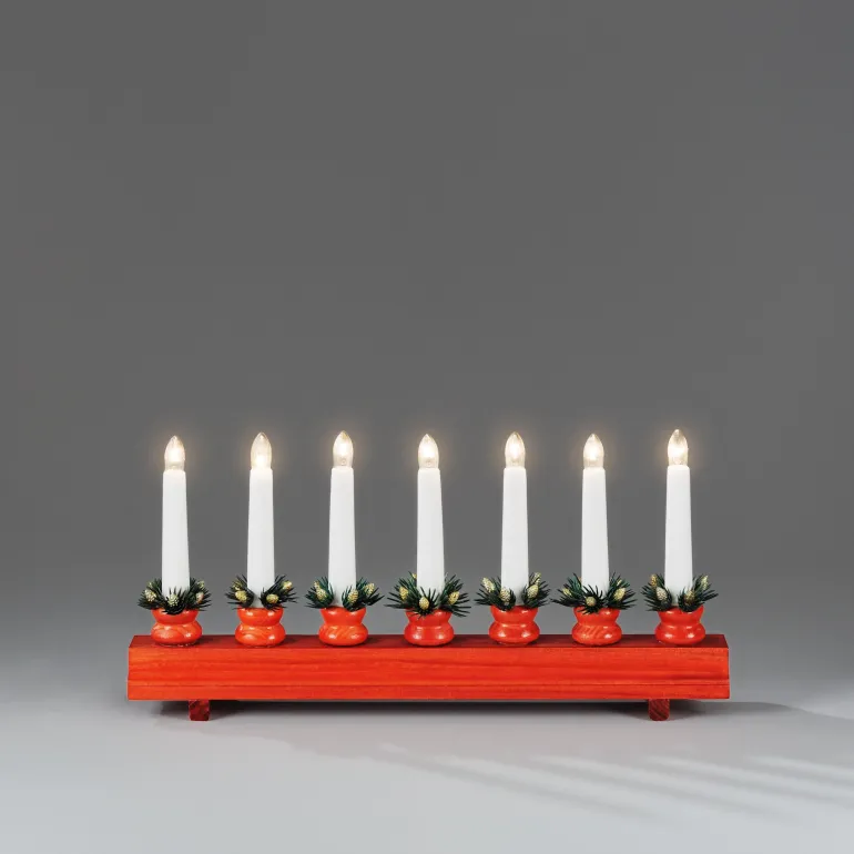 Konstsmide 1010-500 on matala puinen sähkökynttelikkö 7 kynttilällä (punainen lakattu). Valoteho 8 lm ja valkoisen kytkimellisen johdon pituus 170 cm, 230 V. IP20.