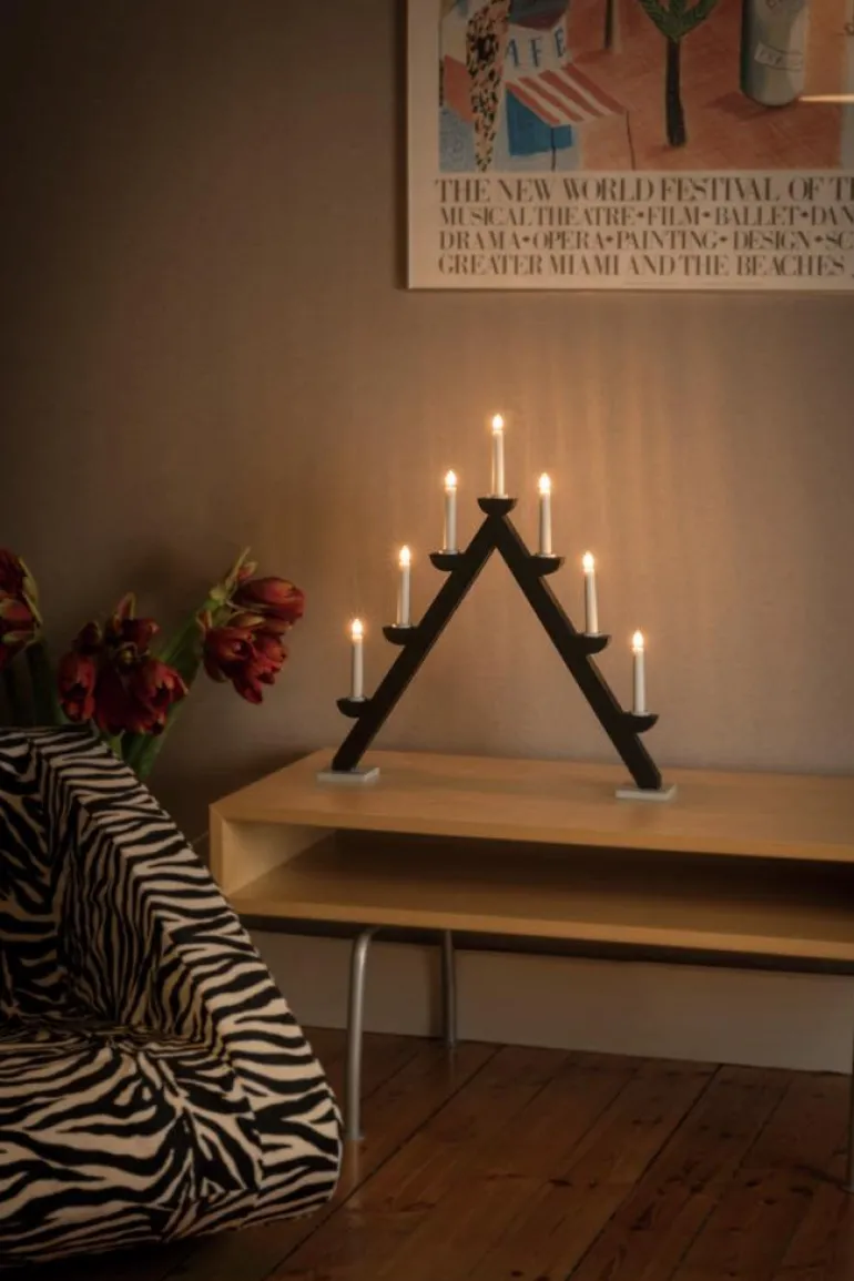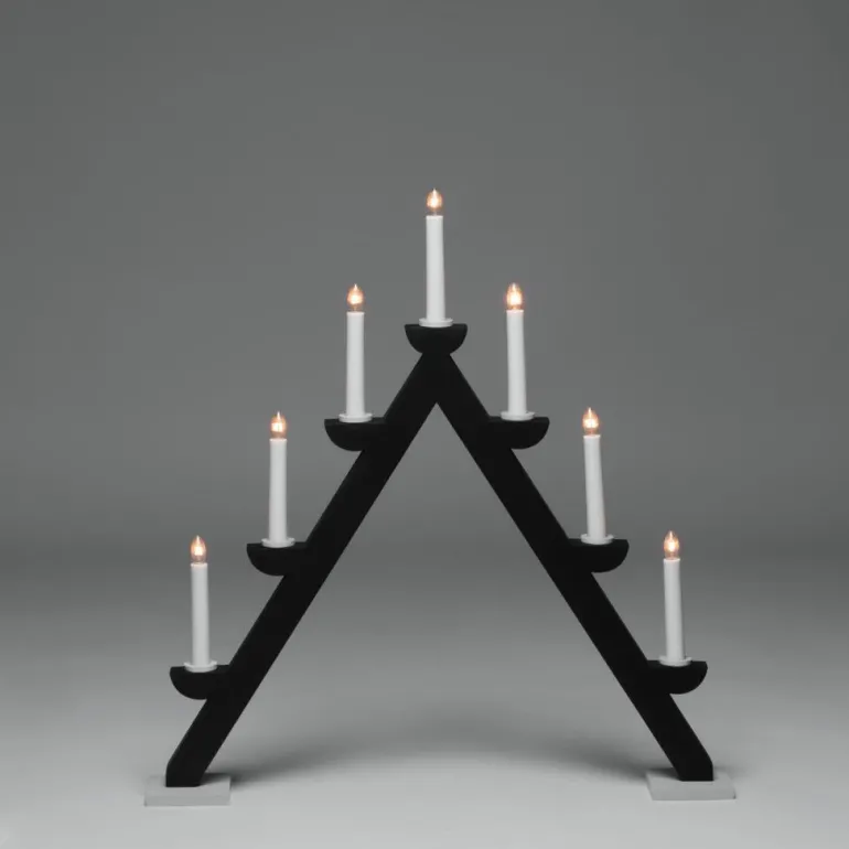 Konstsmide 3992-735 on puinen sähkökynttelikkö 7 kynttilällä. Musta, harmailla renkailla. Kytkimellä, 230V / IP20.