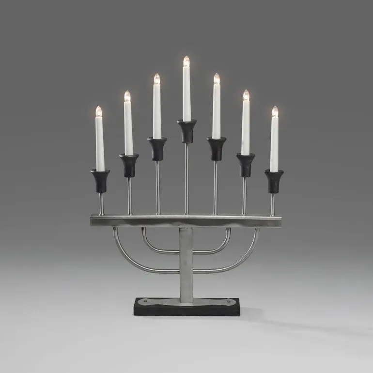 Kynttelikkö harjattua metallia seitsemällä kynttilällä. Virtalähteenä 24 voltin muuntaja.