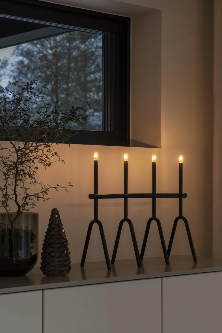 Konstsmide 3911-710TR on musta metallinen sähkökynttelikkö 35 cm. 4 LEDiä, lämmin valkoinen.