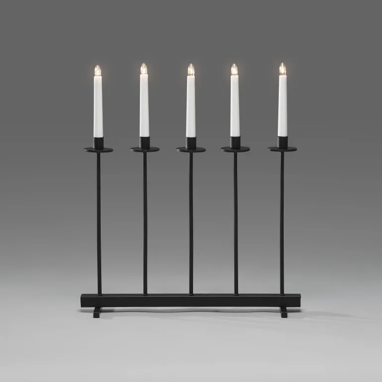 Konstsmide 3558-710TR on musta sähkökynttelikkö 5 kynttilällä. Metallia, mustalla johdolla jossa kytkin.