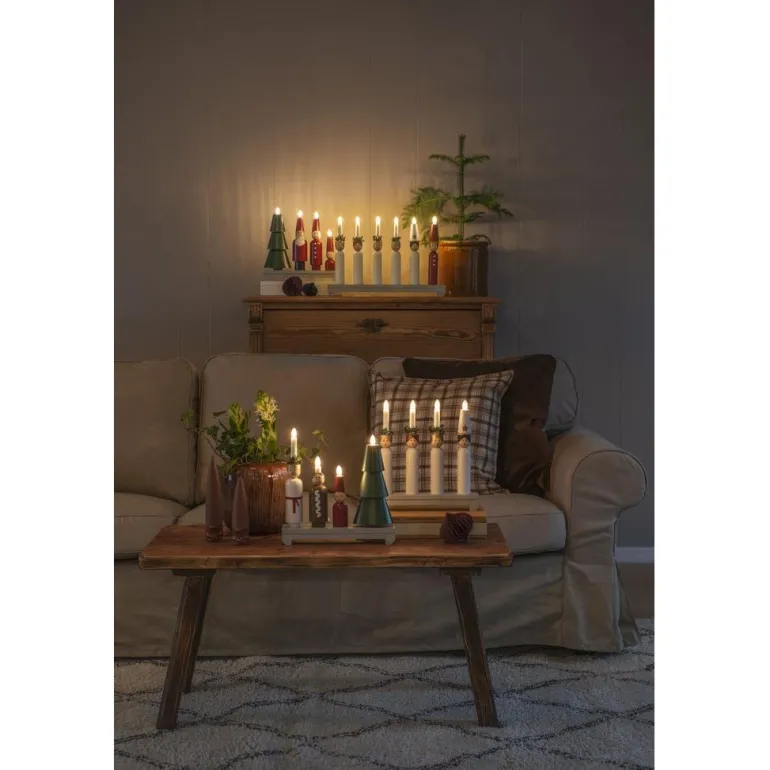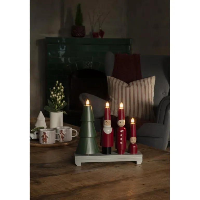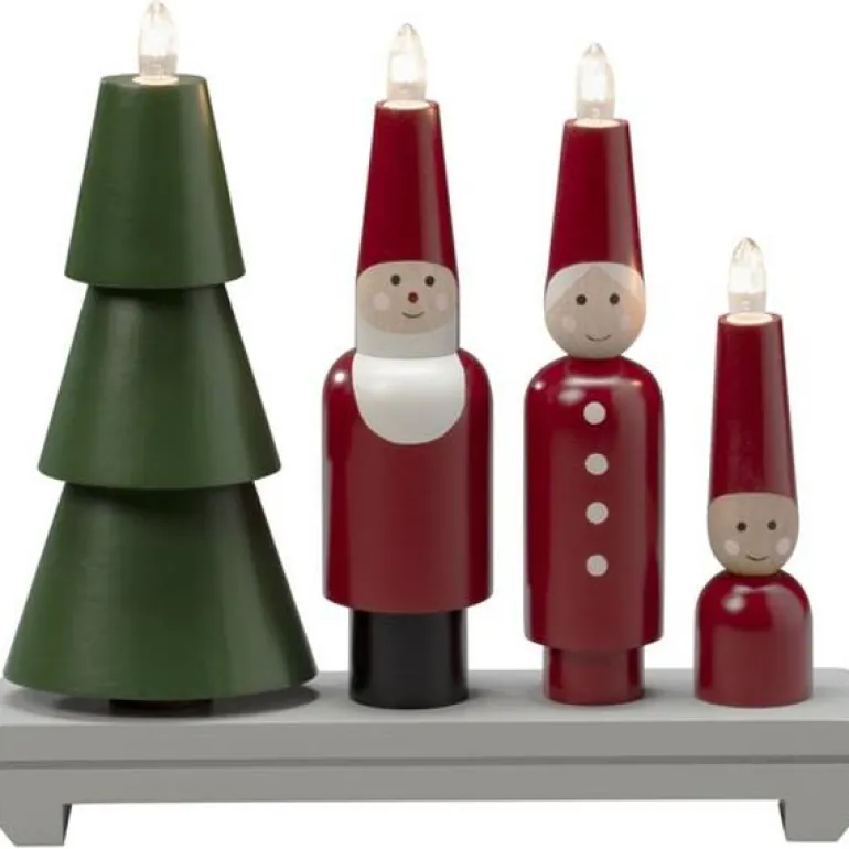 Sähkökynttelikkö, joka koostuu joulupukin perheestä ja kuusesta. Kynttelikkö on käsinmaalattu mattalakalla. Korkeus 28 cm ja leveys 29 cm. Sisältää 4 vaihdettavaa valonlähdettä. Liitäntäkaapelin pituus on 1,7 m.