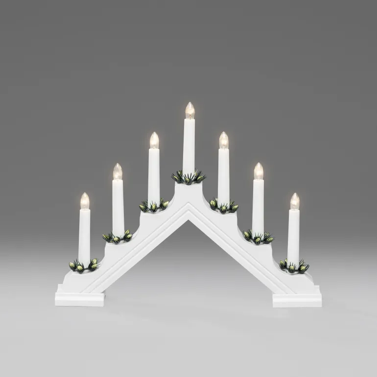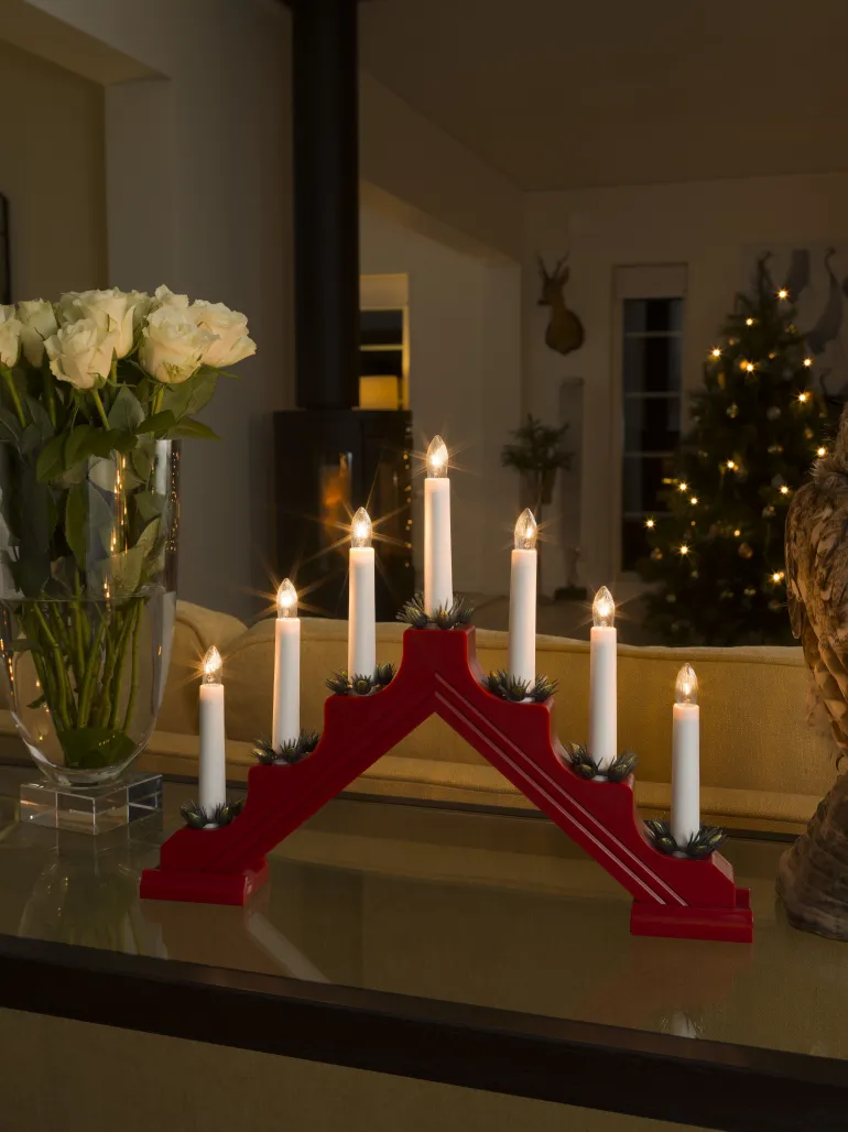 Konstsmide 2310-510 on sähkökynttelikkö klassisella muotoilulla. 7 kynttilää, materiaali muovi ja koristerenkaat (mänty). Väri punainen. Johto 170 cm kytkimellä, IP20/230 V.