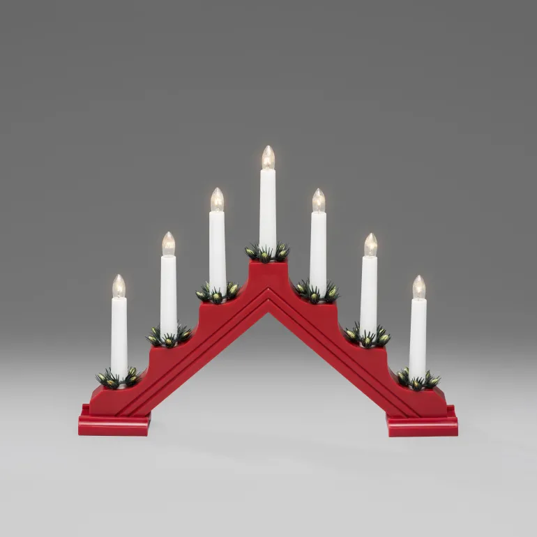 Konstsmide 2310-510 on sähkökynttelikkö klassisella muotoilulla. 7 kynttilää, materiaali muovi ja koristerenkaat (mänty). Väri punainen.
