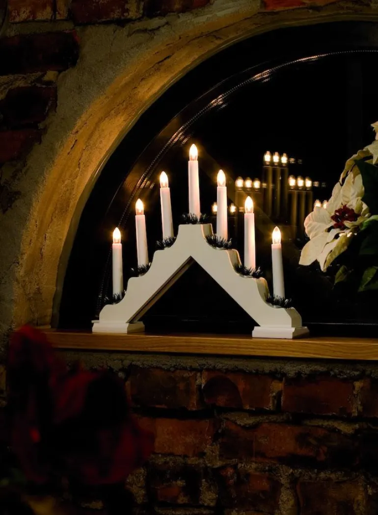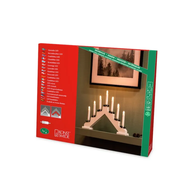 Konstsmide 2262-210LB on klassinen valkoiseksi maalattu puinen sähkökynttelikkö, jossa on 7 valopistettä. Sähkökynttelikön kirkkaus on 6 luumenia, ja se on varustettu valkoisella 170 cm:n pituisella johdolla, jossa on kytkin.