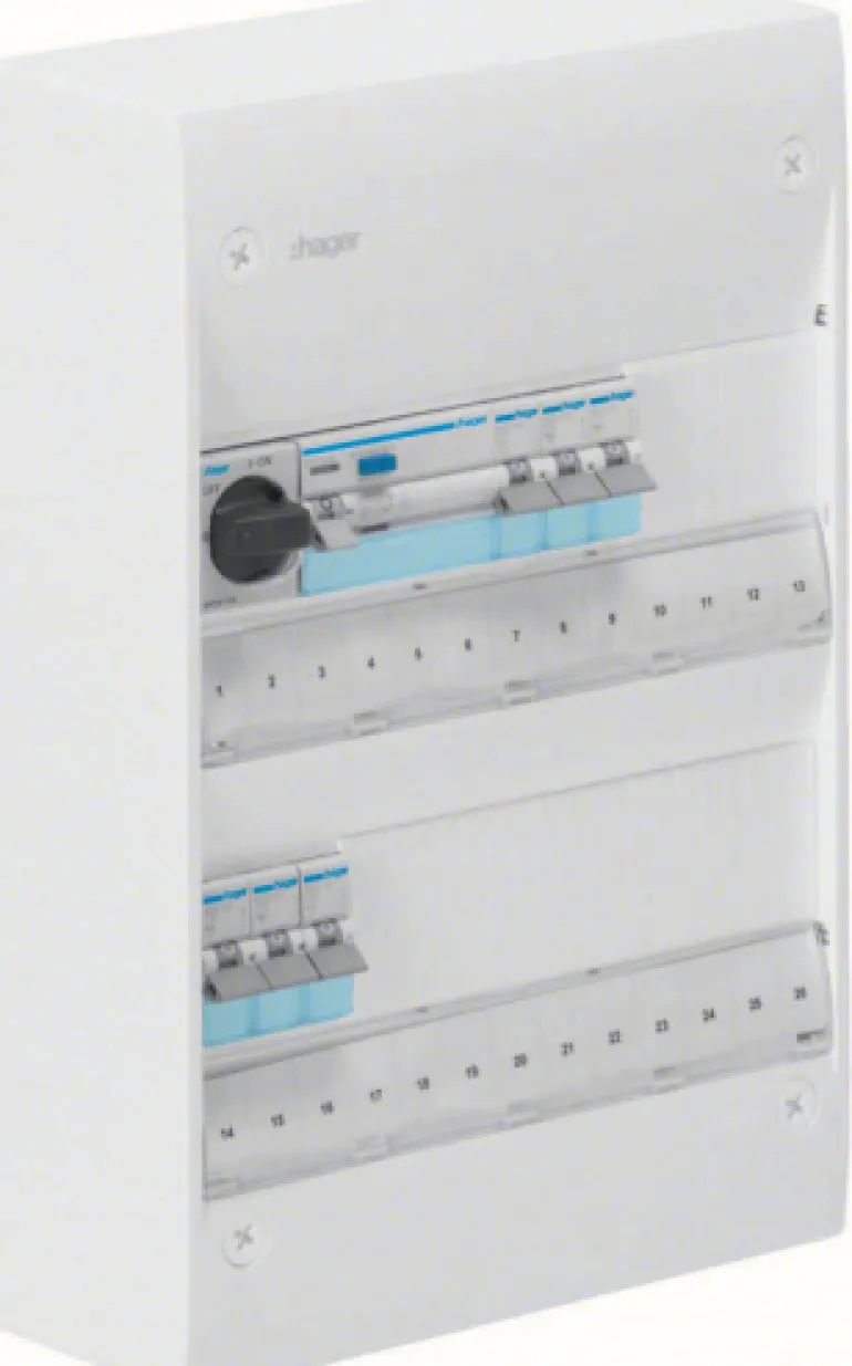 Esiasennettu kytkentäkaappi 13 ja 18 moduulin levyisenä. Sisältää: 1 kpl HB 40A, 1 kpl JFB 25A, 3 automaattisulaketta, 10A C-käyrällä, 6 kA/rivi. Keskukseen voidaan lisätä ovi ja takalevy (katso Gamma-lisävarusteet).