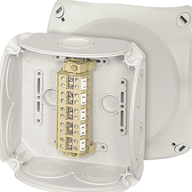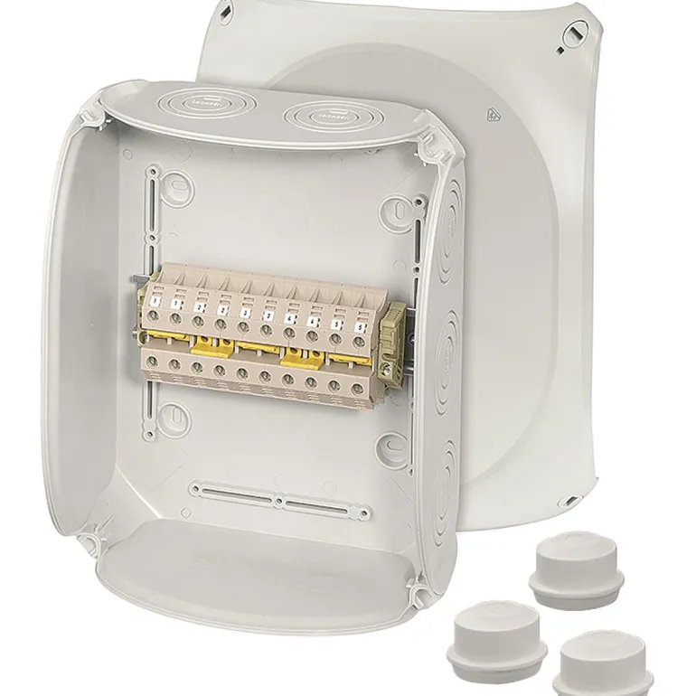 Kytkentärasia, jossa on liittimet ja elastiset kalvot, jotka voidaan helposti irrottaa kaapelin läpivientiä varten kaapelin kiinnittimen kautta. Kansiruuvit ovat tiivistettävissä ilman lisävarusteita Kaapelin läpivienti pohjassa Alumiinijohtimet on valmisteltava voimassa olevien teknisten suositusten mukaisesti ennen liittämistä.