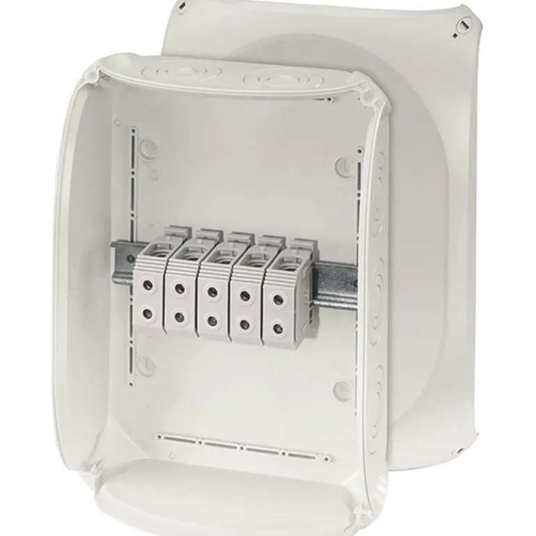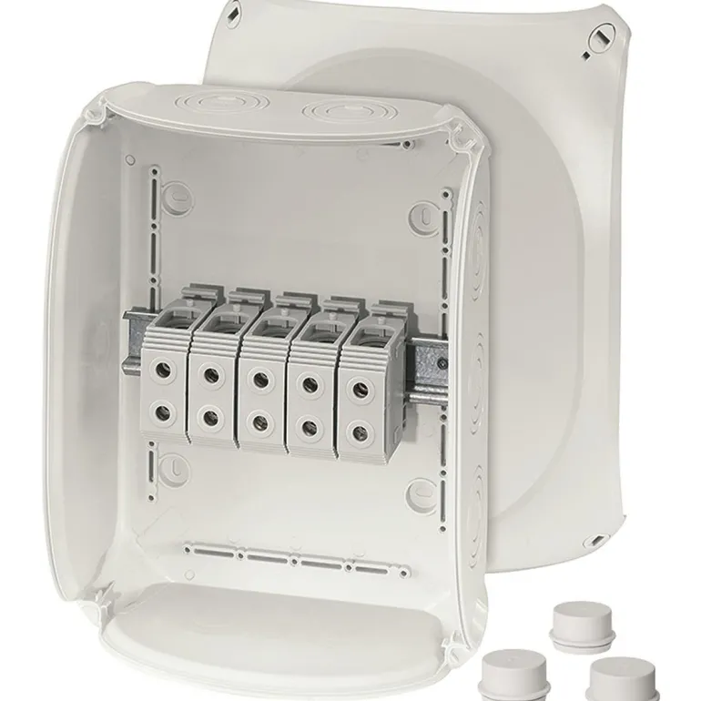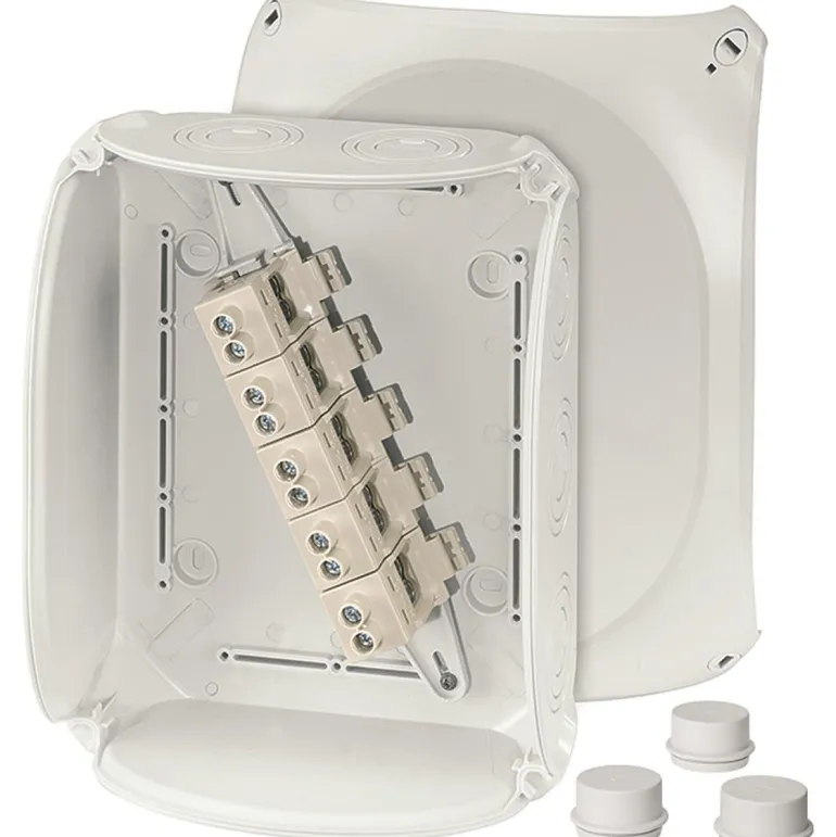 Kytkentärasia liittimellä, integroidut elastiset kalvot, jotka voidaan helposti irrottaa ennen kaapelin asettamista kaapeliliitosten kautta. Kaapelin läpivienti pohjassa mahdollistaa kansiiruuvien tiivistämisen ilman lisävarusteita. Sisältää kiinnityshihnat ja ulkoseinäkiinnittimet