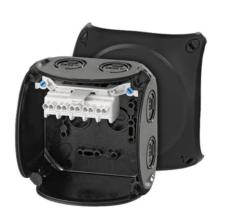 Kytkentärasia lasikuituvahvistettua polykarbonaattia vaativiin ympäristöihin asennettavaksi. Nimellisjännite 690V. Hyvä UV-kestävyys. Laatikossa on 5-napainen liitin kaapeleille Toimitetaan läpivientiaukkoineen ja aukoilla erikseen tilattaville ruuviliittimille. Laatikot ovat Länsförsäkringarin suosittelemia käytettäväksi maatalouskäyttöön.Kansissa on pikalukitus ja näkyvä lukitusasento. Monivaiheiset läpivientiaukot erikokoisille kaapelikiinnikkeilleja myös kaapeliläpivienti pohjassa Kaikki liittimet kahdella kiinnikkeellä napaa kohden, jotka voidaan asettaa eri liitinasentoihin ja eri kiinnitysvaihtoehdoilla. Korotetut liittimet, joissa on runsaasti tilaa liitännöille sekä kyky liittää eri johdinkokoja ja kaapelityyppejä. Laatikon mukana toimitetaan aina ulommat liittimet