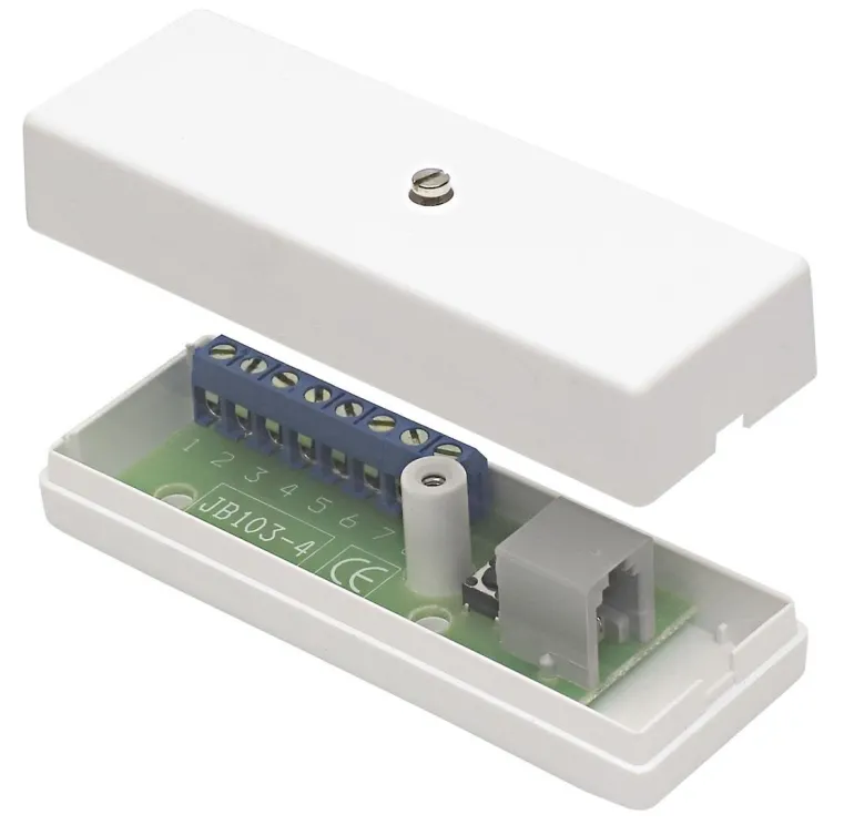 Kytkentärasia, jossa on 8 ruuviliitintä johdinsuojalla ja 4/4 modulaarinen liitin GD 335-S tai GD 375-S lasirikkoilmaisimen liittämistä varten. Ilkivaltasuojakytkin sarjassa hälytyssilmukan kanssa modulaarisessa liittimessä.