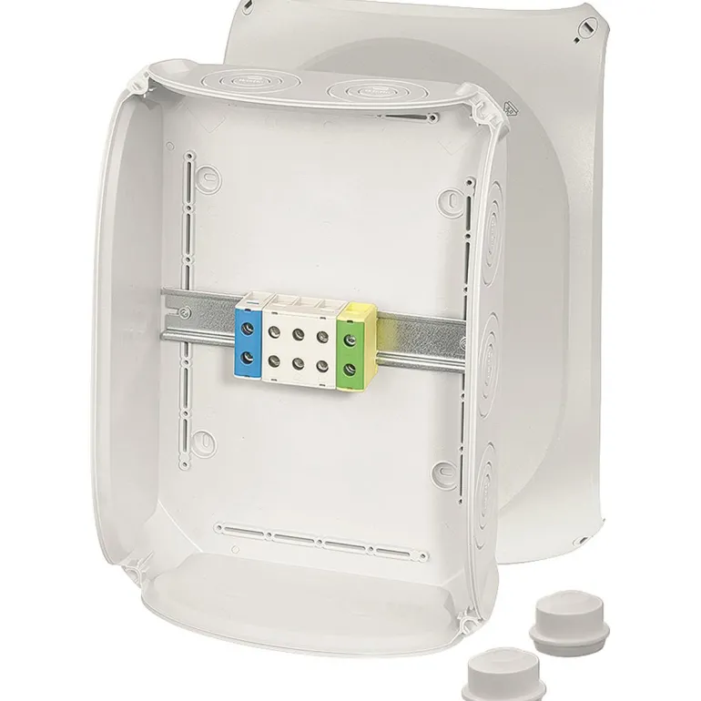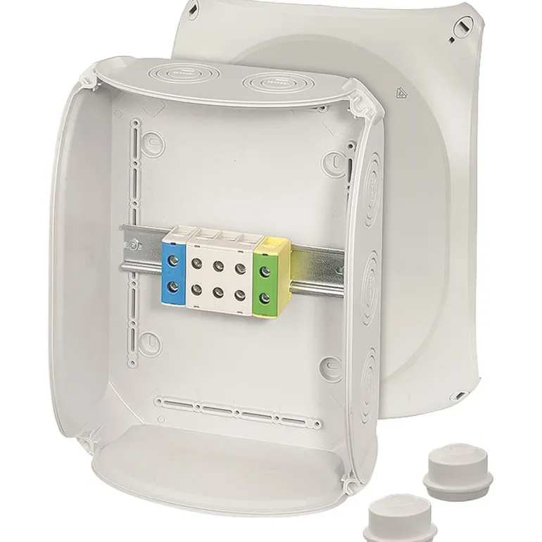 Kytkentärasia liittimillä 5-napainen, pylvästä kohti 2 x 1x 1,5-50 mm², Mukana kaapelin läpivienti: 2 EDK, Jos halutaan suojausluokka IP 66 / IP 67 / IP 69, tilaa kaapelitiivisteet AKM erikseen kahdella kaapelin läpiviennillä M32 pohjassa. Alumiinijohtimet on valmisteltava sovellettavien teknisten suositusten mukaisesti ennen niiden kytkemistä. Katso alumiinijohtimia koskevat tekniset tiedot. Kansiruuvit voidaan sulkea ilman lisävarusteita Ulkokannattimet seinäasennusta varten sisältyvät toimitukseen