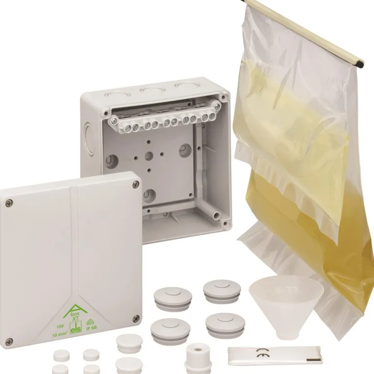 Kytkentärasia liittimillä valettavaksi standardin DIN EN 60670 ja EN 60529 mukaisesti, säänkestävä ja iskunkestävä, asennettavaksi tulva-alueille ja maaperään ilman liikennekuormitusta, Ui=690V, kaksoistiivistyssillalla M32, tiivistyshalkaisija 14-21mm, valupussilla 1200ml (ei merkitty), suppilo, ilmanvaihtotulppa ja kertakäyttökäsineet, suojausluokka IP68, nimellinen poikkileikkaus 10², iskunkestävyys IK08, suojausluokka II, halogeeniton, VDE-hyväksytty, 140x140x79, harmaa, 5-napainen, 10mm² (4×4²/4×6²/4×10²)