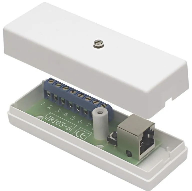 Kytkentärasia, jossa on 8 ruuviliitintä johdinsuojalla ja 6/6 modulaarinen liitin GD 330-S tai GD 370-S lasirikkoilmaisimen liittämistä varten. Ilkivaltasuojakytkin sarjassa hälytyssilmukan kanssa modulaarisessa liittimessä