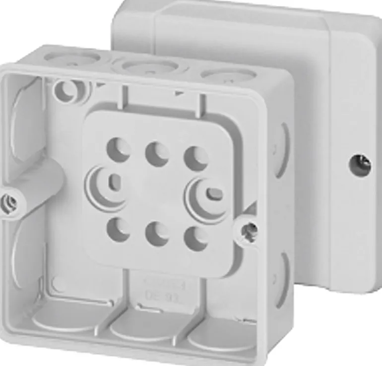 Iskunkestävästä harmaasta termoplastista. Luokitus IP55. Rasiassa on 10 kalvoläpivientiä Ø 6,5-18 mm:n kaapeleille. Kaikissa rasioissa on tiiviste valettuna kannen ja rasian välissä, mukana toimitetaan kaksi kansialuslevyä kiinnitysruuveja varten. Kansien ruuvit ovat ruostumatonta terästä, jossa on suuri kierrenousu