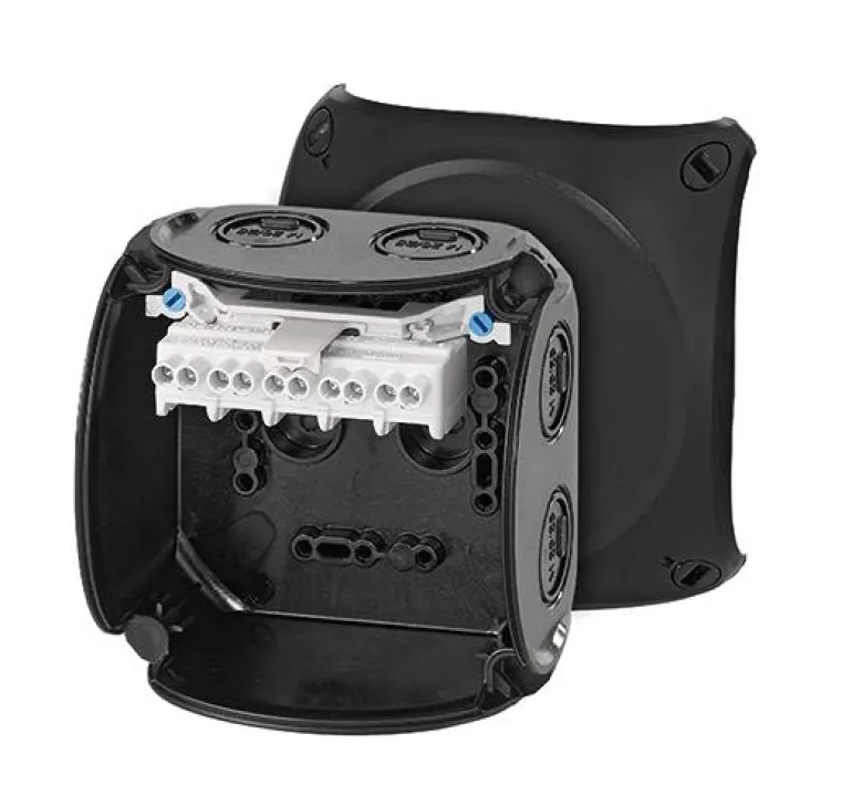 Kytkentärasia lasikuituvahvistettua polykarbonaattia vaativiin ympäristöihin asennettavaksi. Nimellisjännite 690V. Hyvä UV-kestävyys. Laatikossa on 5-napainen liitin kaapeleille Toimitetaan läpivientiaukkoineen ja aukoilla erikseen tilattaville ruuviliittimille. Laatikot ovat Länsförsäkringarin suosittelemia käytettäväksi maatalouskäyttöön.Kansissa on pikalukitus ja näkyvä lukitusasento. Monivaiheiset läpivientiaukot erikokoisille kaapelikiinnikkeilleja myös kaapeliläpivienti pohjassa Kaikki liittimet kahdella kiinnikkeellä napaa kohden, jotka voidaan asettaa eri liitinasentoihin ja eri kiinnitysvaihtoehdoilla. Korotetut liittimet, joissa on runsaasti tilaa liitännöille sekä kyky liittää eri johdinkokoja ja kaapelityyppejä. Laatikon mukana toimitetaan aina ulommat liittimet