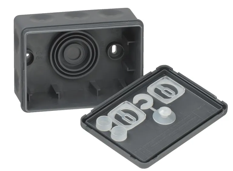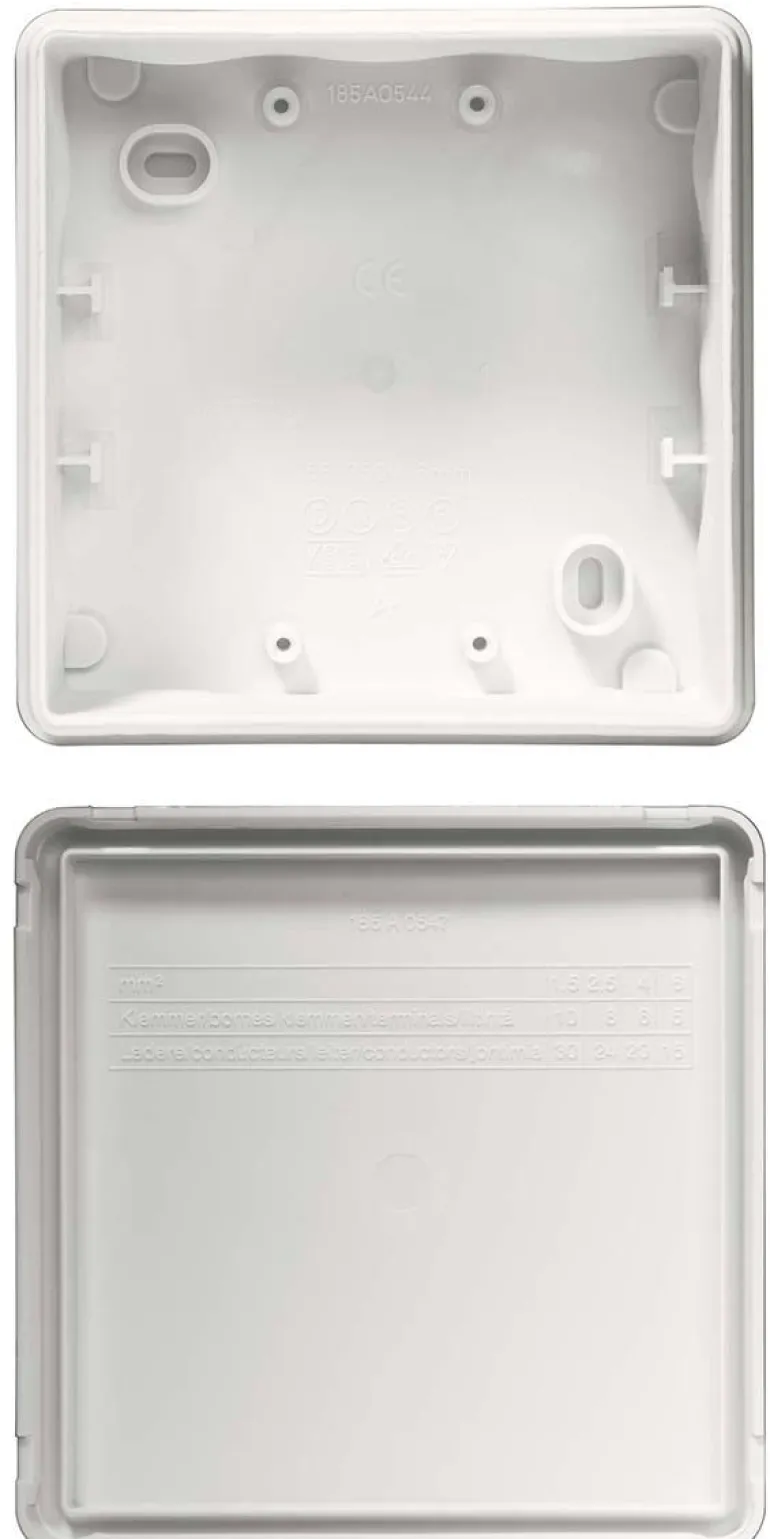 Kapseloitu malli valkoisesta halogeenittomasta 2-komponenttimateriaalista. Pikakiinnitettävä kansi ilman ruuveja. Upotetut kalvonipat, joista 2 pohjassa. Toimitetaan ilman liitinkiinnikkeitä. Aukot tehdään kaapelilla, ei työkaluilla.
