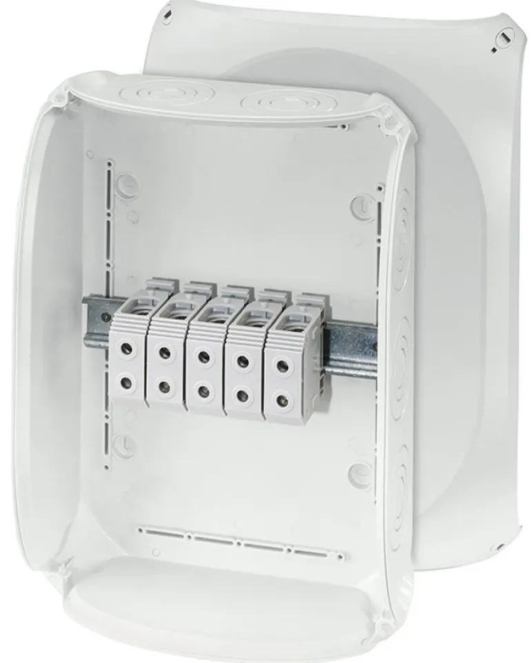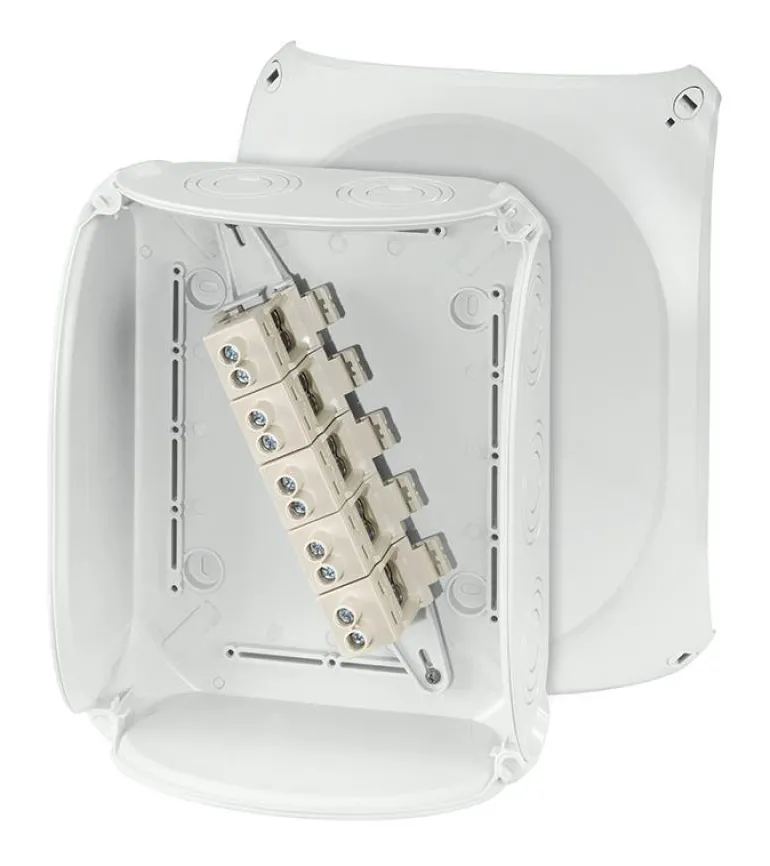 Kytkentärasia, jossa on liitin. Kannessa on pikalukitus ja näkyvä lukitusasento. Monivaiheiset läpivientiaukot erikokoisille kaapelikiinnikkeilleja myös kaapeliläpivienti pohjassa Kaikki liittimet kahdella kiinnikkeellä napaa kohden, jotka voidaan asettaa eri liitinasentoihin ja eri kiinnitysvaihtoehdoilla. Korotetut liittimet, joissa on runsaasti tilaa liitännöille sekä kyky liittää eri johdinkokoja ja kaapelityyppejä Laatikon mukana toimitetaan aina ulkoiset kiinnittimet.