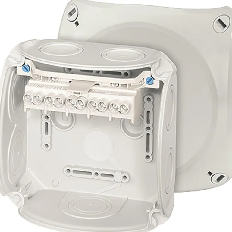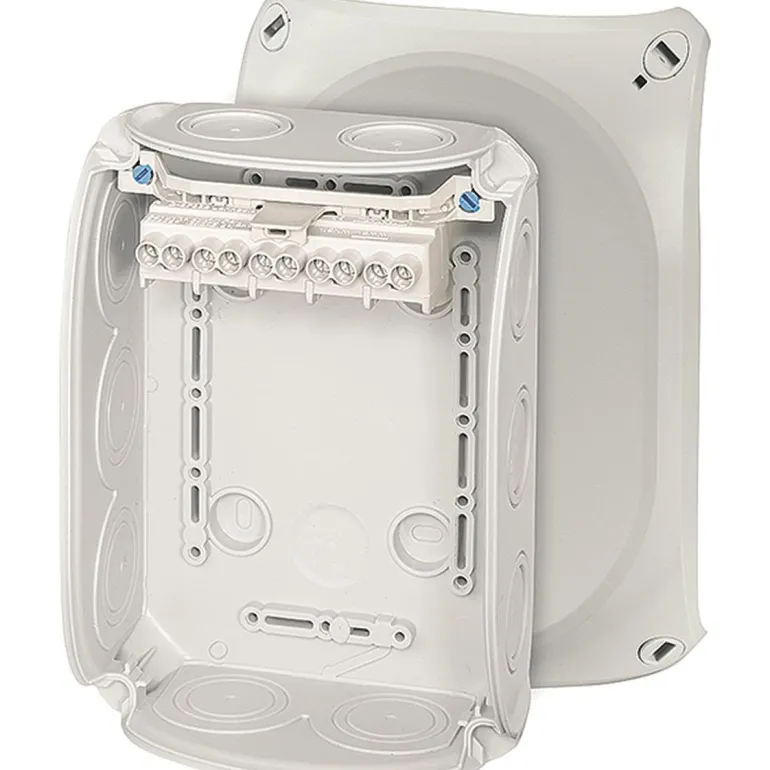 Kytkentärasia liittimellä, integroidut elastiset kalvot, jotka voidaan helposti irrottaa ennen kaapelin asettamista kaapeliliitosten kautta. Kaapelin läpivienti pohjassa mahdollistaa kansiiruuvien tiivistämisen ilman lisävarusteita. Sisältää kiinnityshihnat ja ulkoseinäkiinnittimet