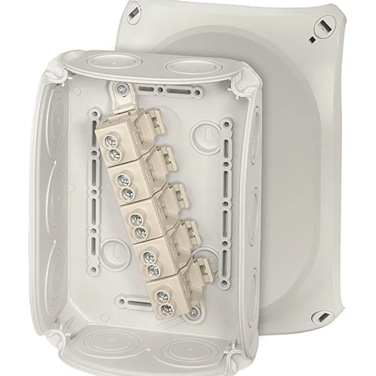 Kytkentärasia liittimellä, integroidut elastiset kalvot, jotka voidaan helposti irrottaa ennen kaapelin asettamista kaapeliliitosten kautta. Kaapelin läpivienti pohjassa mahdollistaa kansiiruuvien tiivistämisen ilman lisävarusteita. Sisältää kiinnityshihnat ja ulkoseinäkiinnittimet