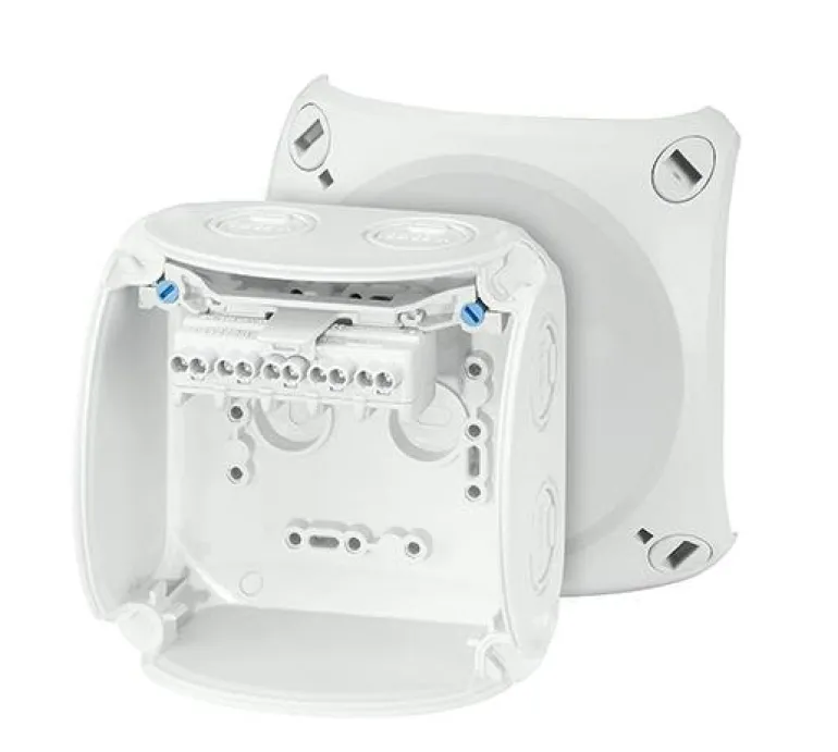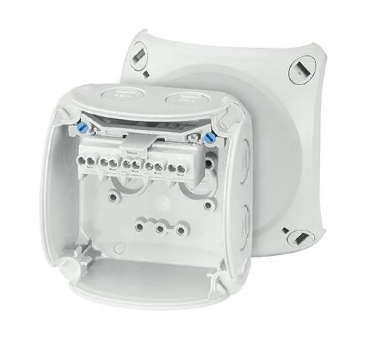 Kytkentärasia, jossa on liitin. Kannessa on pikalukitus ja näkyvä lukitusasento. Monivaiheiset läpivientiaukot erikokoisille kaapelikiinnikkeilleja myös kaapeliläpivienti pohjassa Kaikki liittimet kahdella kiinnikkeellä napaa kohden, jotka voidaan asettaa eri liitinasentoihin ja eri kiinnitysvaihtoehdoilla. Korotetut liittimet, joissa on runsaasti tilaa liitännöille sekä kyky liittää eri johdinkokoja ja kaapelityyppejä Laatikon mukana toimitetaan aina ulkoiset kiinnittimet.
