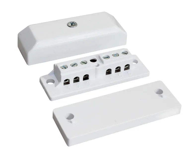 Kytkentärasia, ilkivaltasuojakytkin. Ruuviliittimet, joista 2 ilkivaltasuojakytkintä varten.