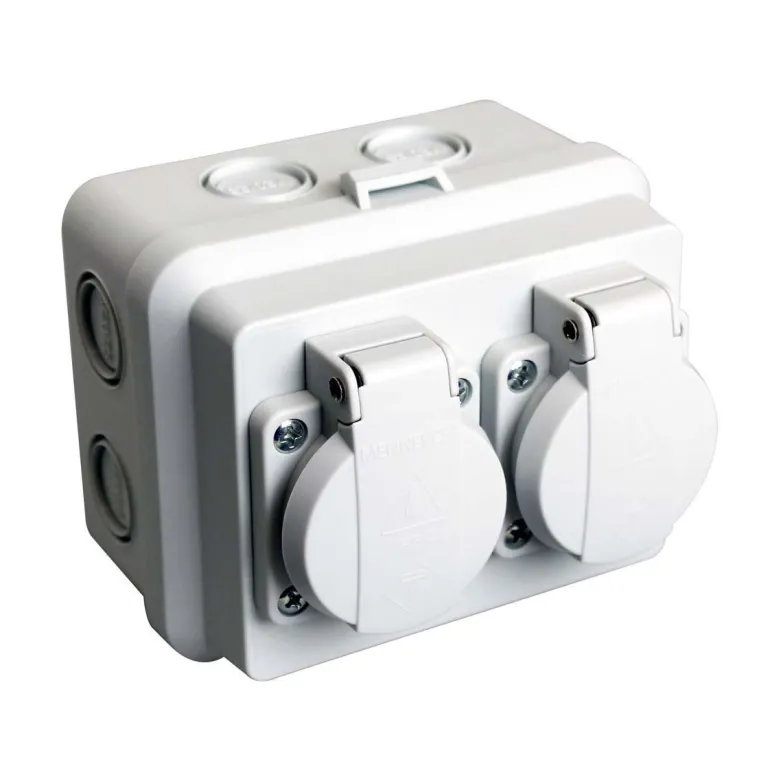 Kytkentärasia 2-osaisella pistorasialla IP54, asennus seinään tai kattoon. Pistorasia kytketään kaapelilla EK 2,5 mm2. Rasiassa on suuri kytkentätila, mikä vähentää ylimääräisen kytkentärasian tarvetta kytkentätöissä. Sisältää 2 läpivientiä E 14 758 04 kaapelin halkaisijalle 4-13 mm.