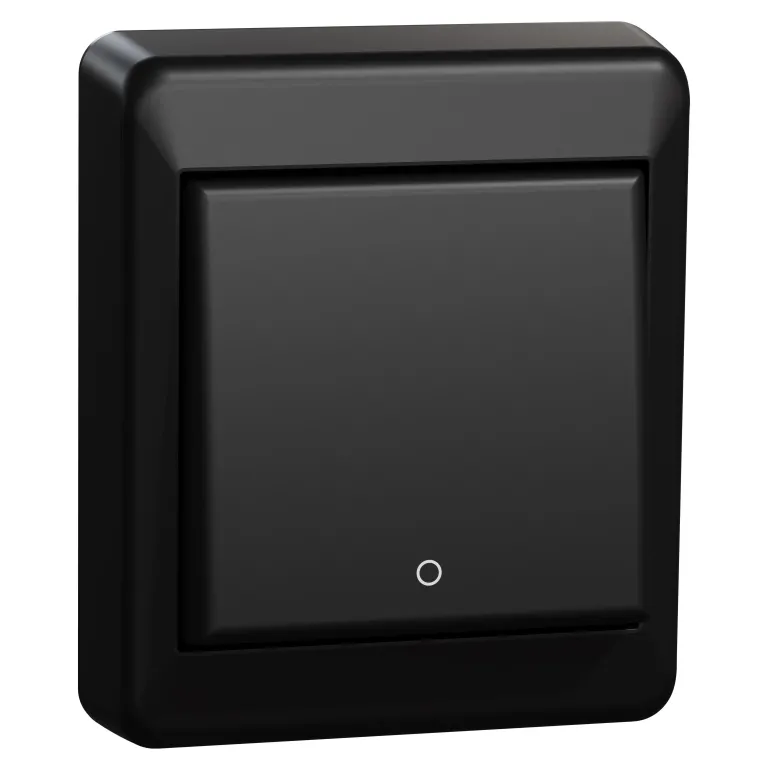 Musta pinta-asennettava kytkin kehyksellä. Valmistettu halogeenittomasta kestomuovista. Ruuvikiinnitys 38 mm:in kiinnitysvälillä. Kaksinkertaiset ruuviliitännät vaihetta kohti. Varustettu taustalevyllä, jossa useita vaihtoehtoisia kiinnitysreikiä. Kytkimessä impulssijousen käyttömahdollisuus painonappitoimintoa varten sekä mahdollisuus merkkivaloyksikön asentamiselle.