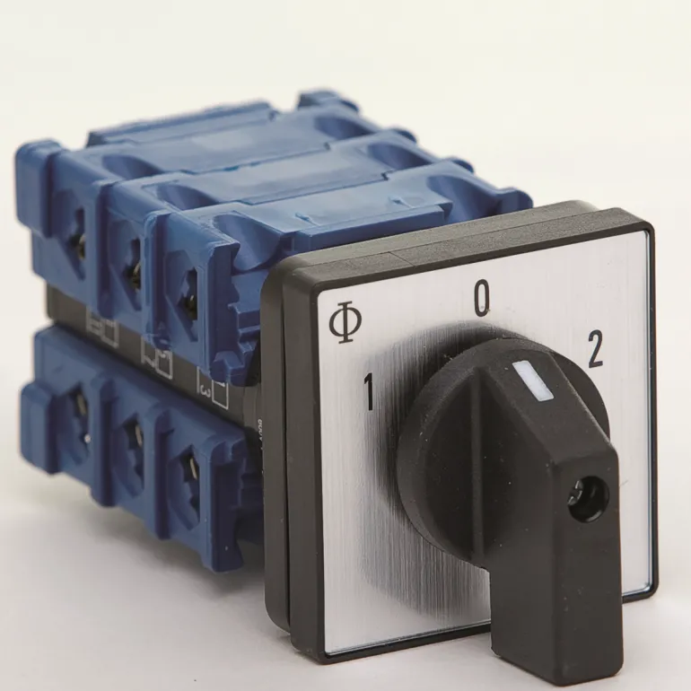 Kytkin 1-0-2, 3-napainen 20A 5-reikäinen paneelikiinnitys (etukoko 48×48 mm).