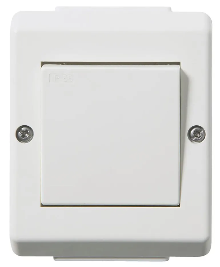 Kytkin kruunukytkimellä ja ruuviliitännällä johtimille. Mallin nimellisjännite on 250 V ja kytkentävirta loisteputkille 10 AX. Mukana toimitetaan kalvonipat, valmistettu halogeenittomasta termoplastista, jonka mitat ovat 67 x 82 x 37 mm.