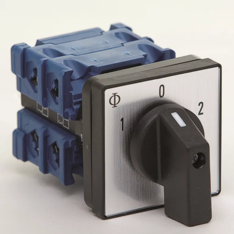 Kytkin 1-0-2, 2-napainen 20A 5-reikäinen paneelikiinnitys (etukoko 48×48 mm).