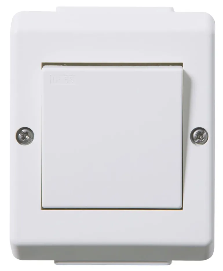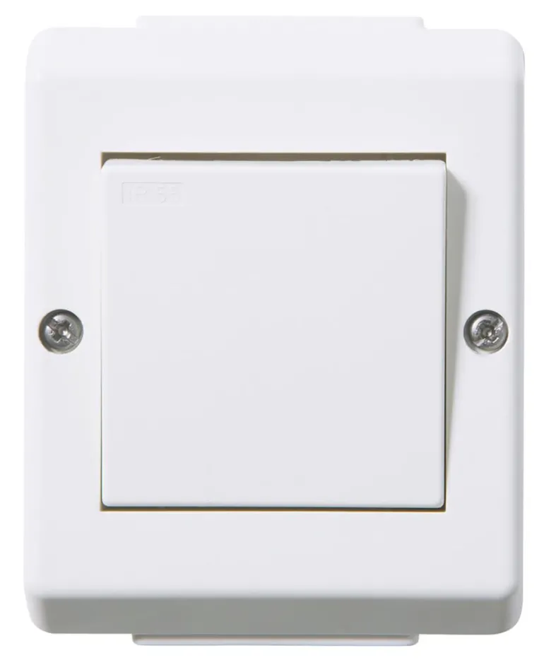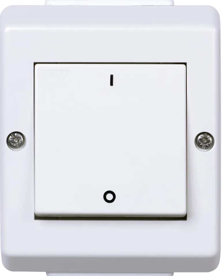 Valkoinen kytkin halogeenittomasta kestomuovista. Johtimien ruuviliitäntä.