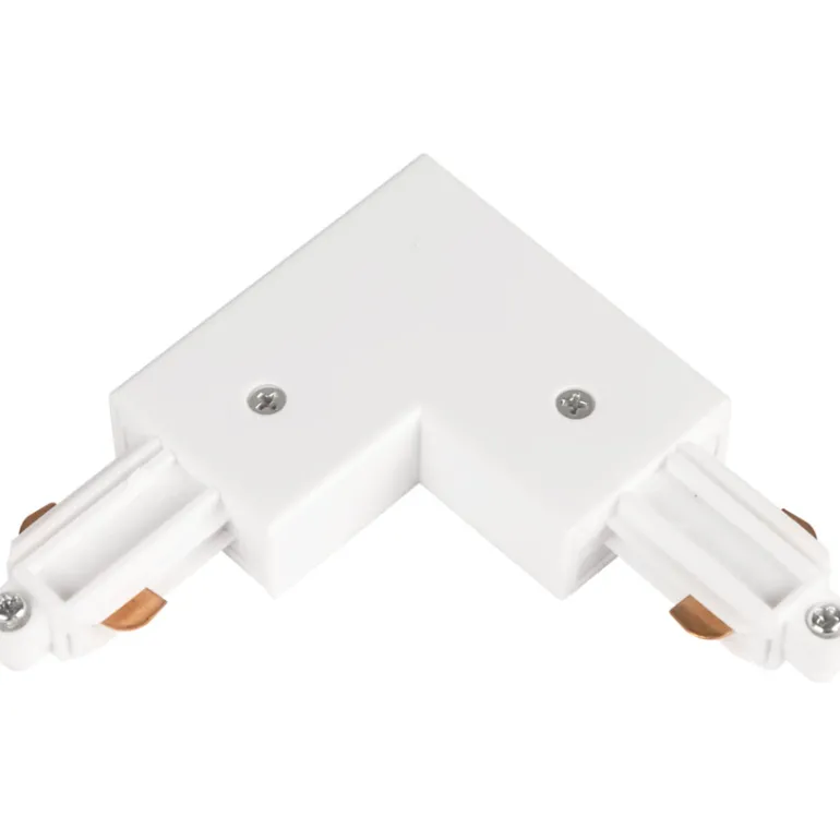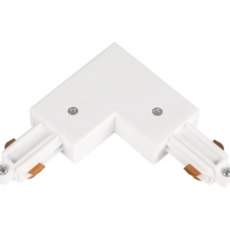 Valkoinen 1-vaiheinen L-liitin, sisäinen. Liitäntä on osa monipuolista kiskojärjestelmää Focus- ja Comfort-sarjan yksivaiheisille piilotetuille tuotteille, joissa jokainen osa myydään erikseen tarpeisiisi sopivaksi.