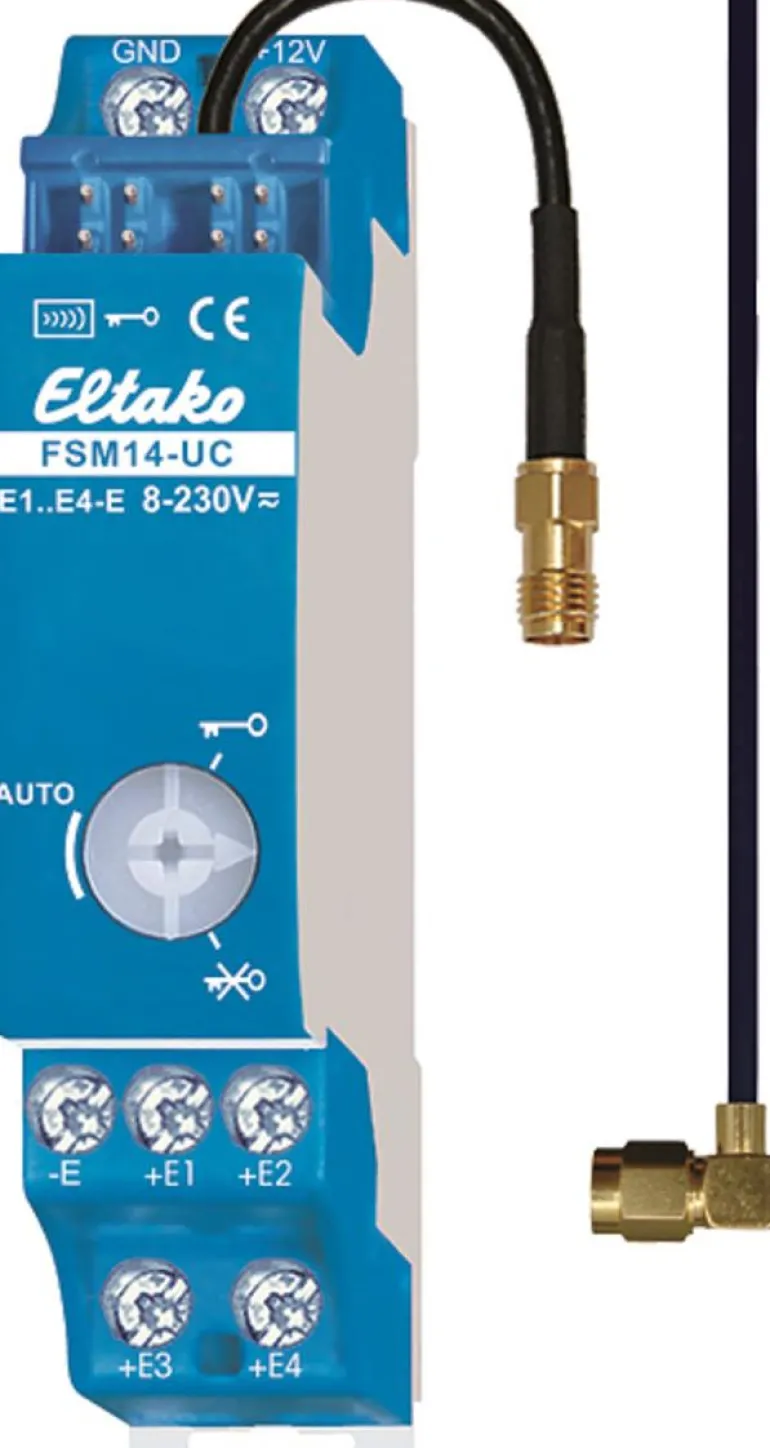 4-kanavainen lähetinmoduuli DIN-asennukseen. Vaihdettavalla antennilla. Toimitettu antenni voidaan tarvittaessa korvata ulkoisella antennilla FA250.