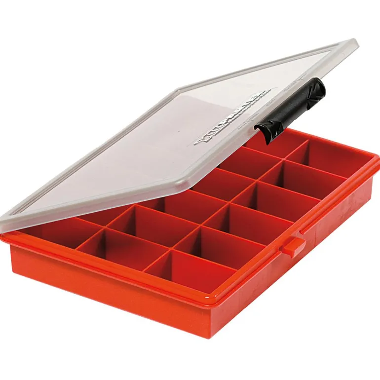 Tyhjä lajitelmalaatikko iskunkestävää muovia. 18 lokerolla.